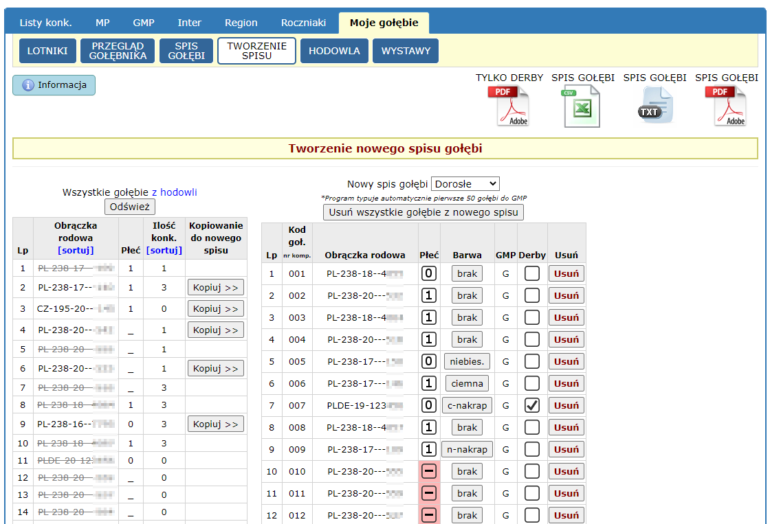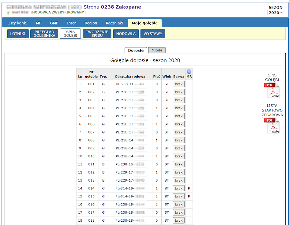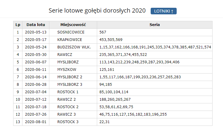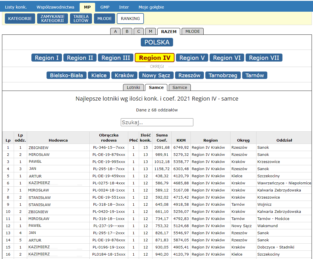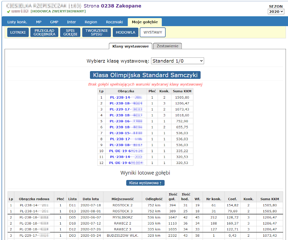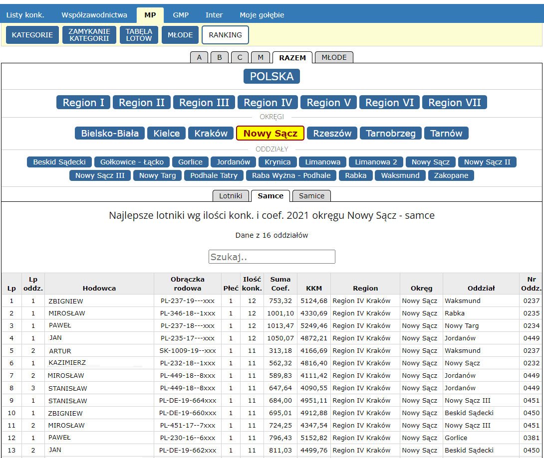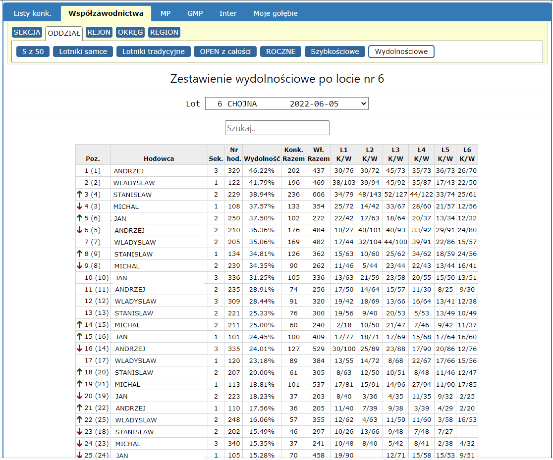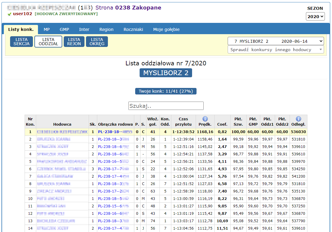 Do wglądu listy gołębi własnych oraz interaktywne listy konkursowe z możliwością filtrowania po nazwisku hodowcy, a nawet po numerze obrączki.