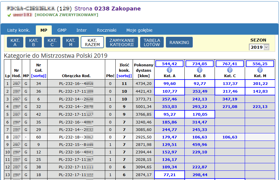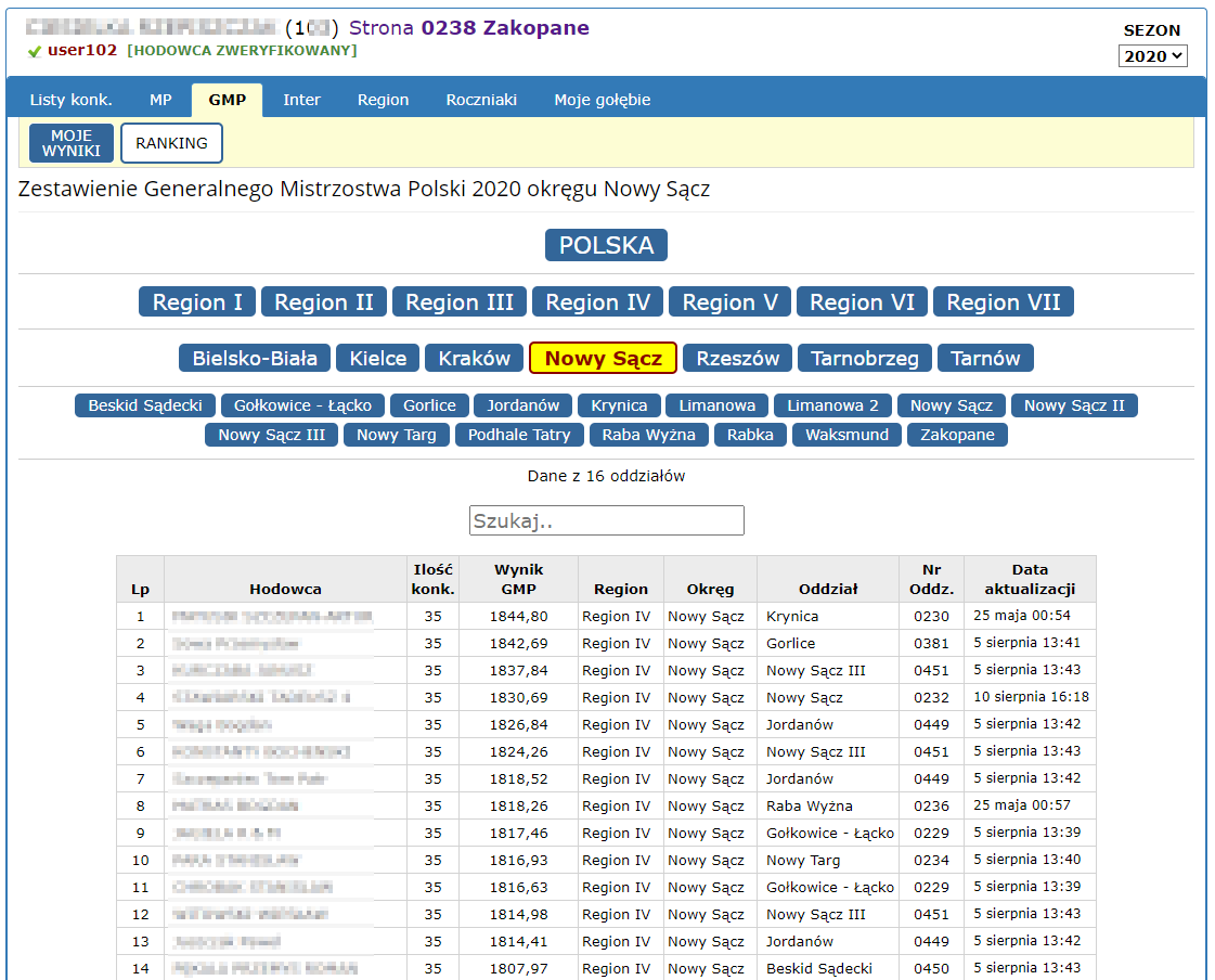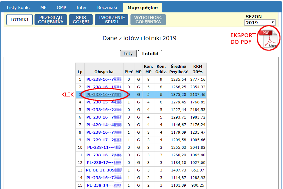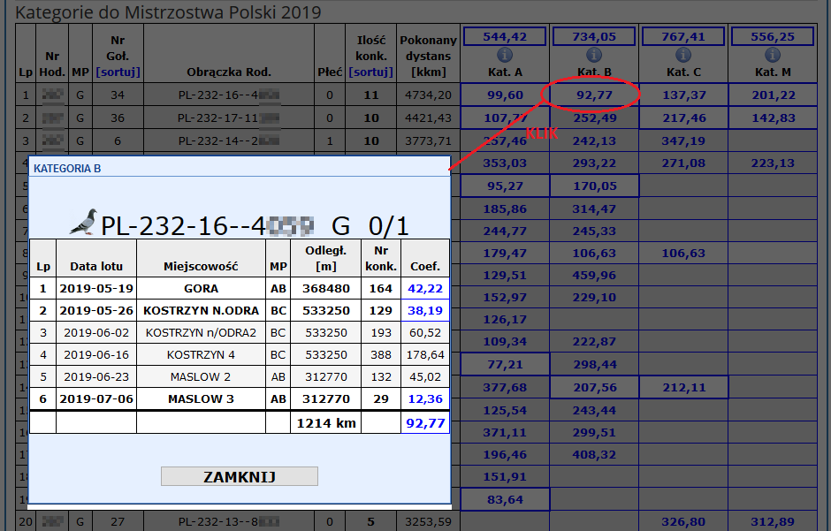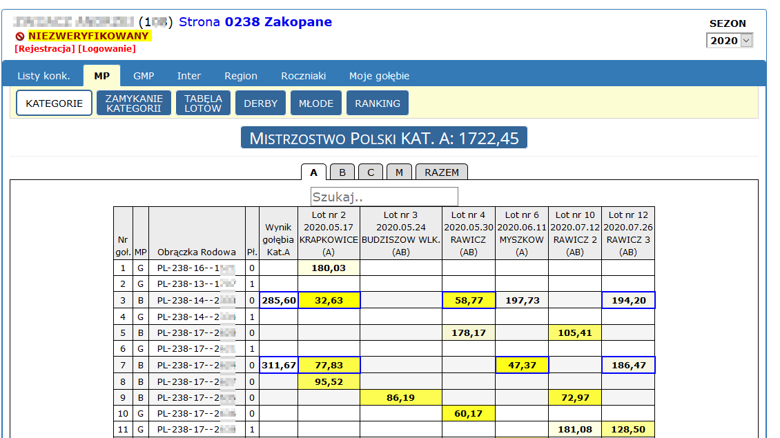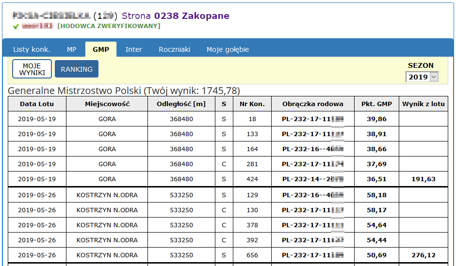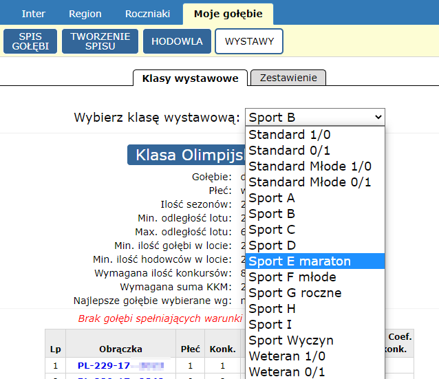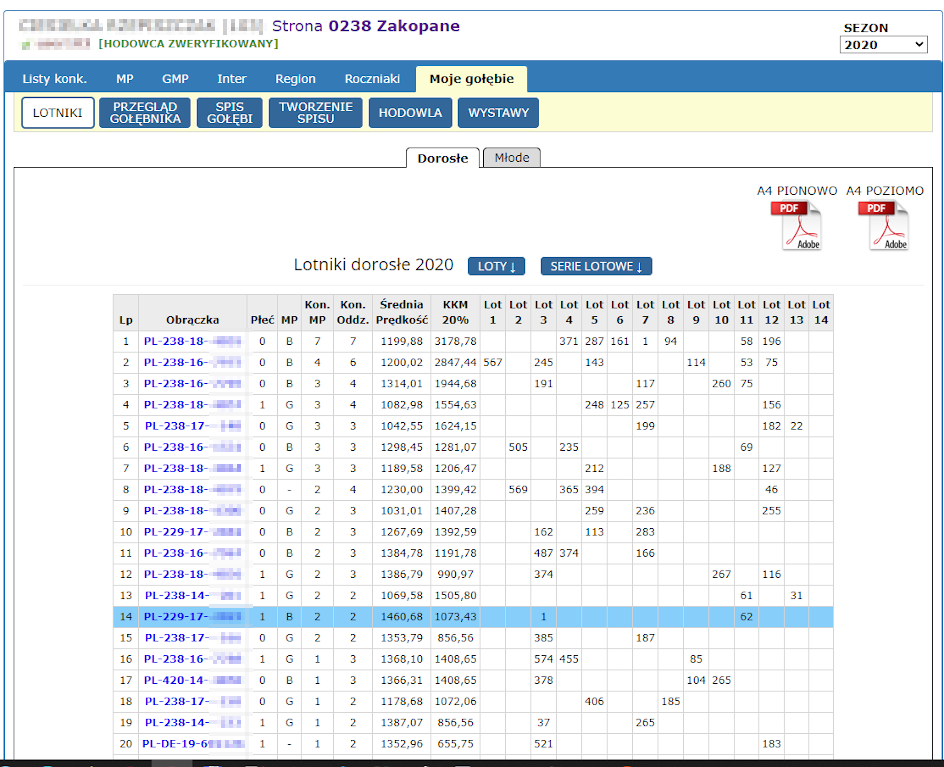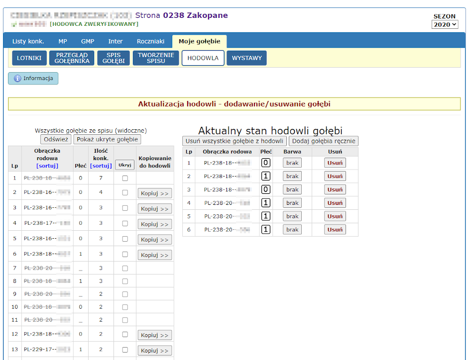 Do wglądu listy gołębi własnych oraz interaktywne listy konkursowe z możliwością filtrowania po nazwisku hodowcy, a nawet po numerze obrączki.