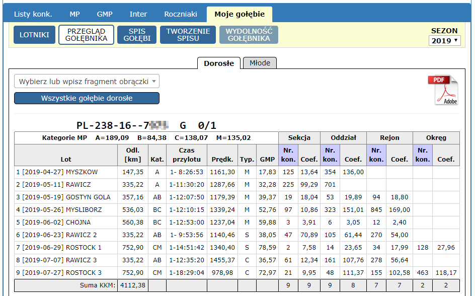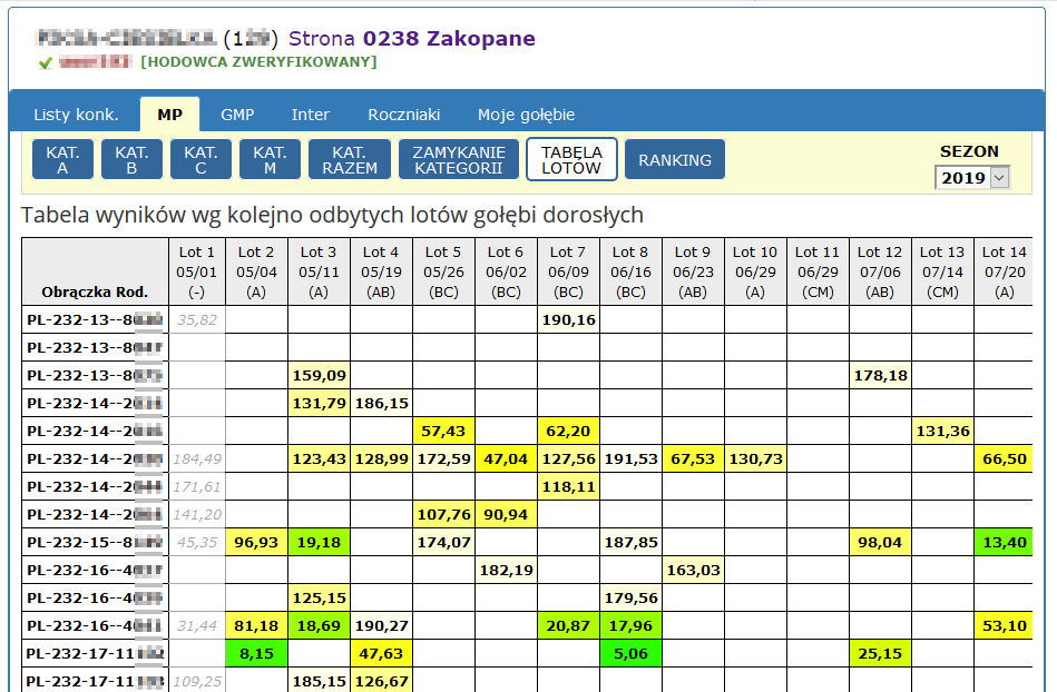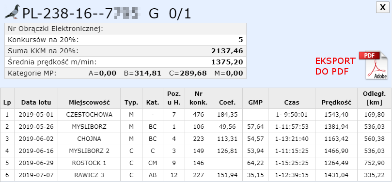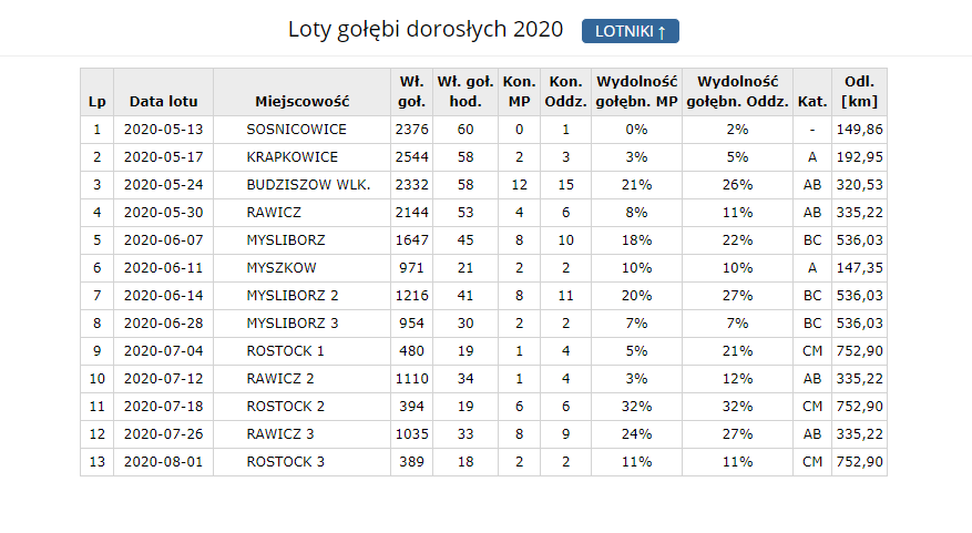 wyników lotowych dla wszystkich swoich gołębi, aktualizowanych bezpośrednio po każdym locie.