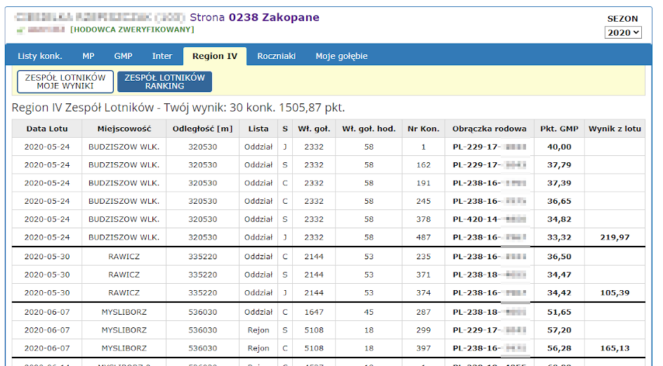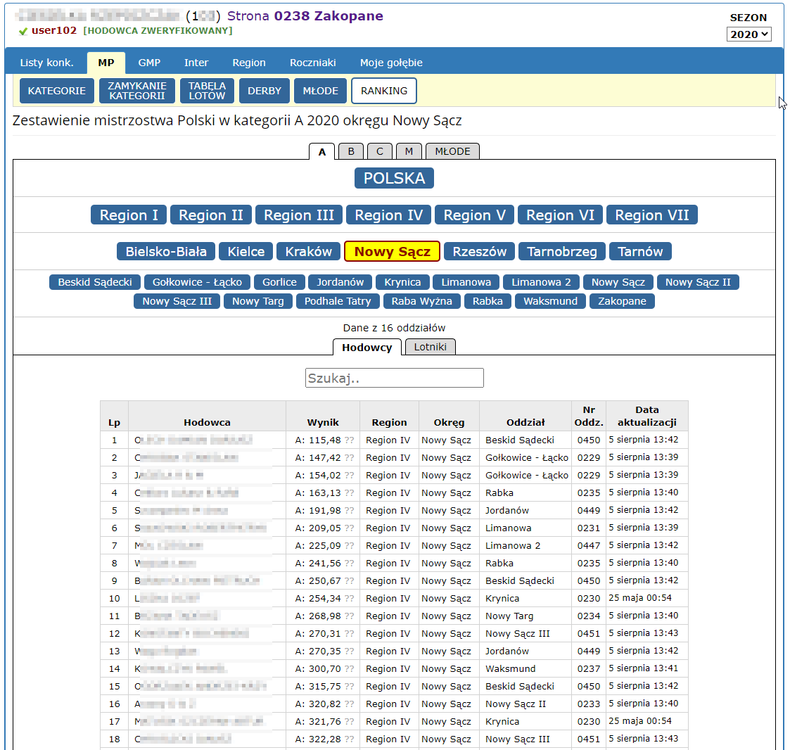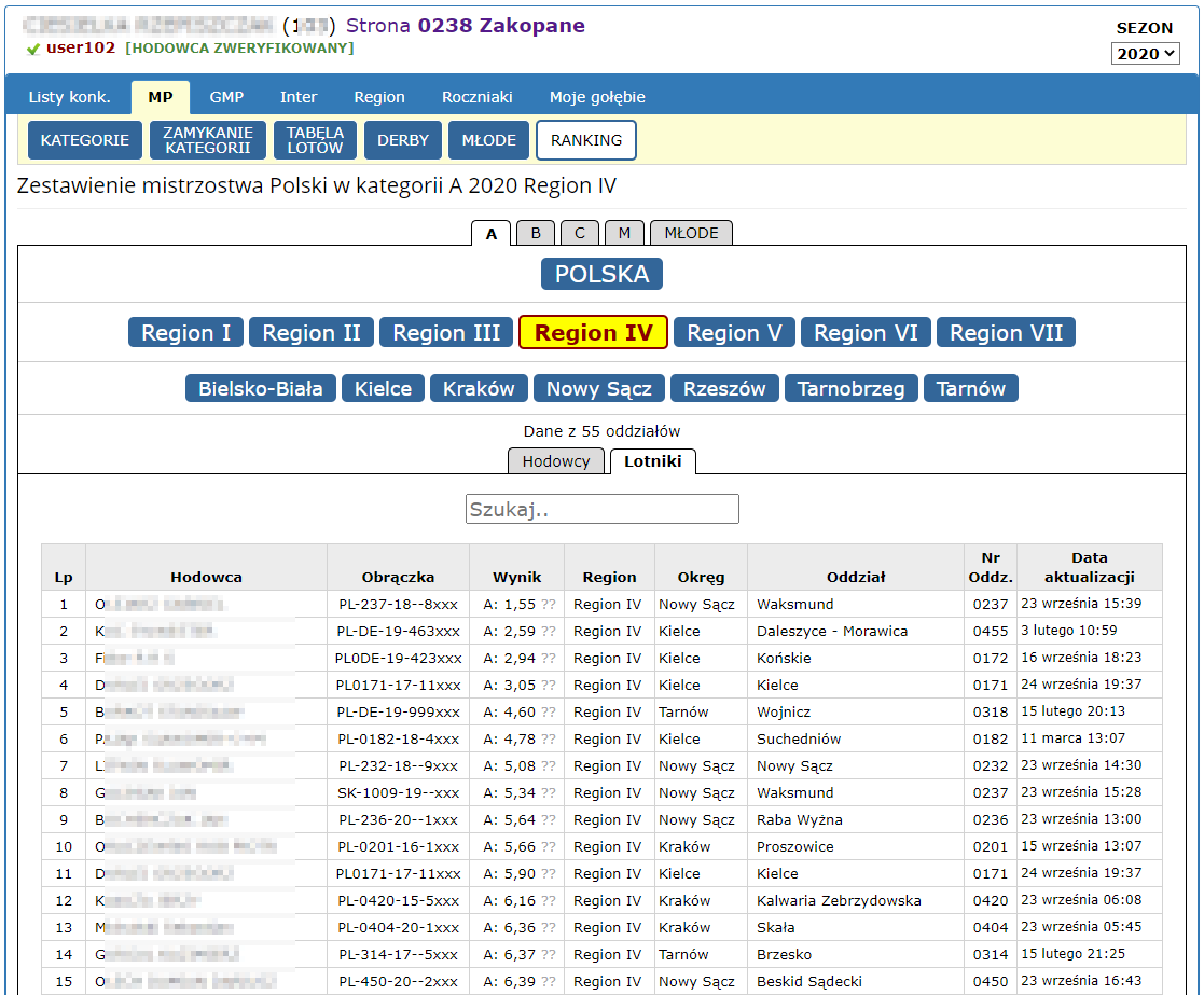 Mistrzostwo Roczniaków, wyniki Regionu, wyniki Derby oraz aktualne Rankingi Oddziałowe i Okręgowe Hodowców (aktualizowane po każdym locie).